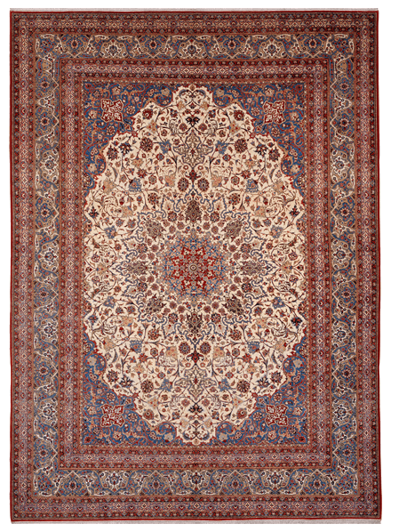 20世紀初期のナイン、殊にツデシク村で生産された絨毯は、緻密で正確な織りで知られているが、縦4メートルを超えるこの絨毯には、その技術力の確かさが示されている。
